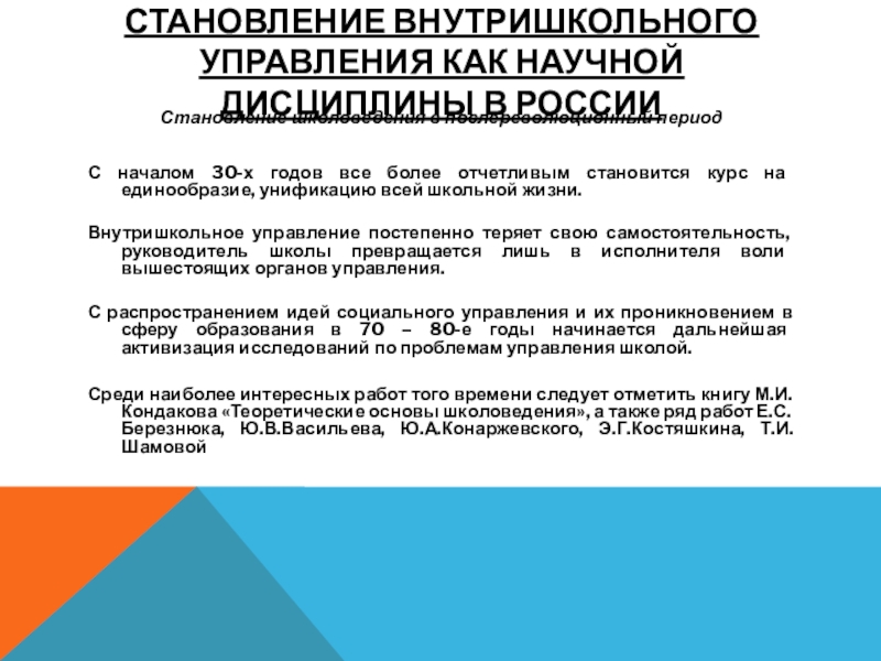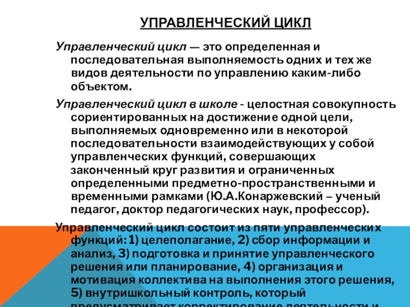 Управленческий цикл в школе - целостная совокупность сориентированных на достижение одной цели, выполняемых одновременно или в некоторой последовательности взаимодействующих у собой управленческих функций, совершающих законченный круг развития и ограниченных определенными предметно-пространственными и временными рамками (Ю.А.Конаржевский – ученый педагог, доктор педагогических наук, профессор).