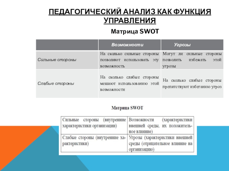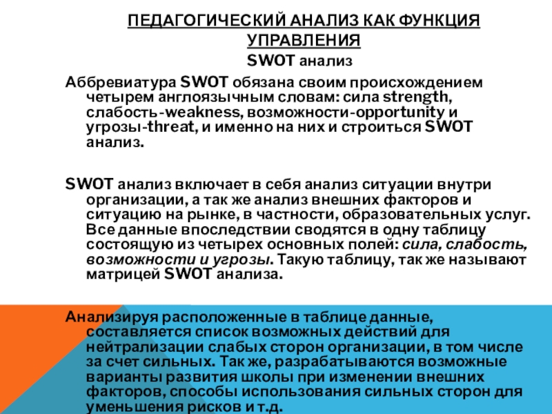 SWOT анализ включает в себя анализ ситуации внутри организации, а так же анализ внешних факторов и ситуацию на рынке, в частности, образовательных услуг. Все данные впоследствии сводятся в одну таблицу состоящую из четырех основных полей: сила, слабость, возможности и угрозы. Такую таблицу, так же называют матрицей SWOT анализа.