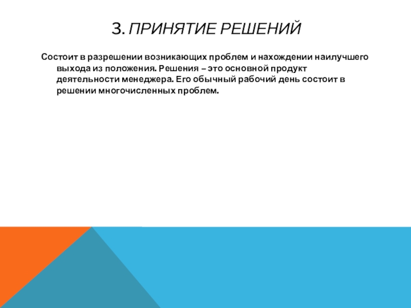 из положения. Решения – это основной продукт деятельности менеджера. Его обычный рабочий день состоит в решении многочисленных проблем.