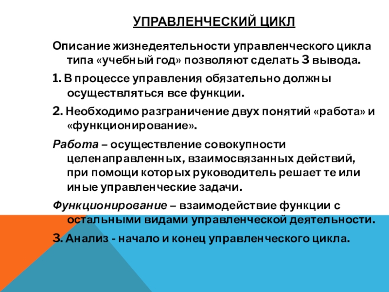 Управленческий цикл состоит из пяти управленческих функций: 1) целеполагание, 2) сбор информации и анализ, 3) подготовка и принятие управленческого решения или планирование, 4) организация и мотивация коллектива на выполнения этого решения, 5) внутришкольный контроль, который предусматривает корректирование деятельности и регулирование отношений.