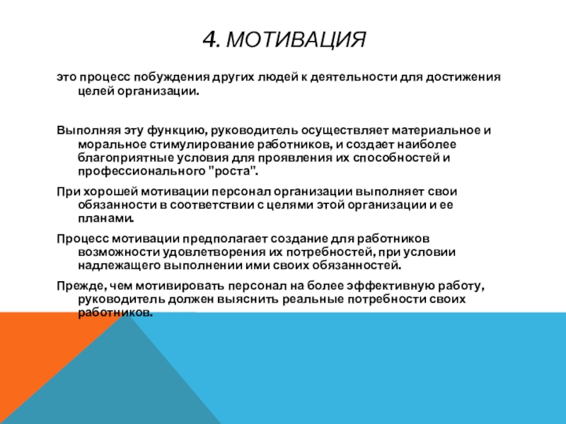 Процесс мотивации предполагает создание для работников возможности удовлетворения их потребностей, при условии надлежащего выполнении ими своих обязанностей.