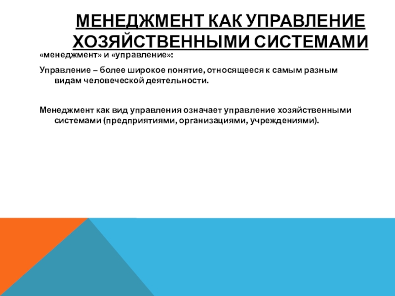 Термин «менеджмент» не является точным синонимом русскому термину «управление». Управлять можно не только предприятием, учреждением, но и автомобилем или ракетой.