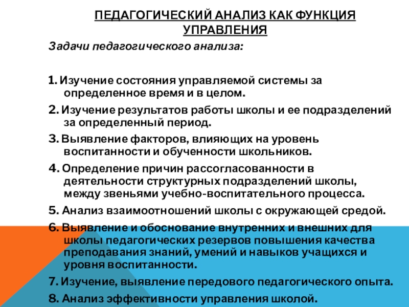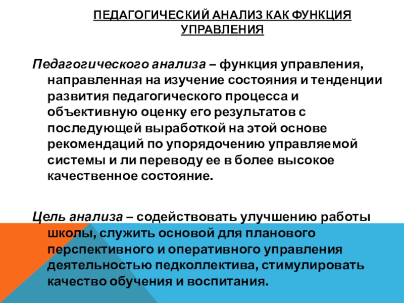изучение состояния и тенденции развития педагогического процесса и объективную оценку его результатов с последующей выработкой на этой основе рекомендаций по упорядочению управляемой системы и ли переводу ее в более высокое качественное состояние.