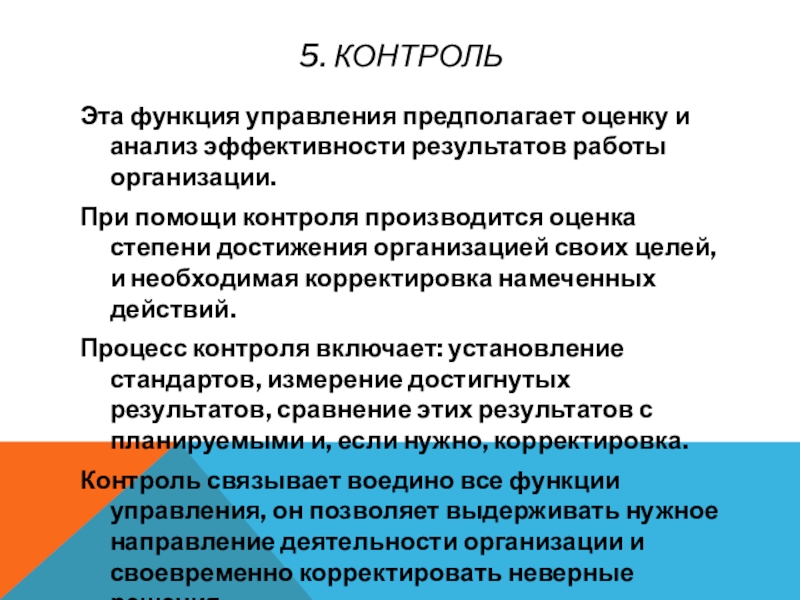 Контроль связывает воедино все функции управления, он позволяет выдерживать нужное направление деятельности организации и своевременно корректировать неверные решения.