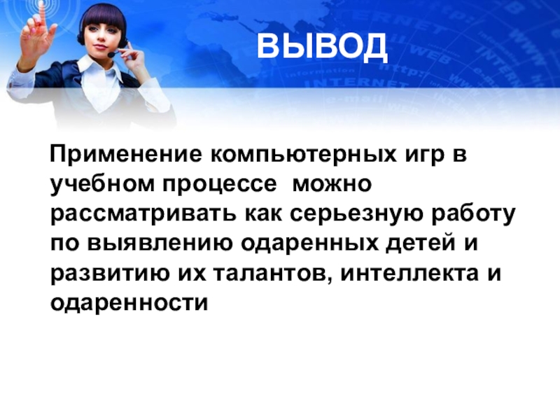 ВЫВОД  Применение компьютерных игр в учебном процессе можно рассматривать как серьезную работу по выявлению одаренных детей