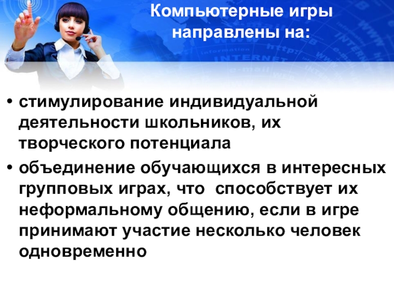 Компьютерные игры направлены на: стимулирование индивидуальной деятельности школьников, их творческого потенциалаобъединение обучающихся в интересных групповых играх, что