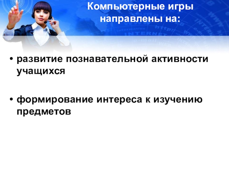 Компьютерные игры направлены на: развитие познавательной активности учащихсяформирование интереса к изучению предметов