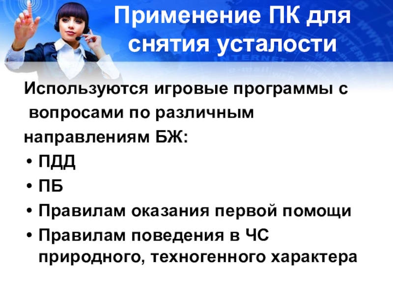 Применение ПК для снятия усталостиИспользуются игровые программы с вопросами по различным направлениям БЖ:ПДДПБПравилам оказания первой помощиПравилам поведения
