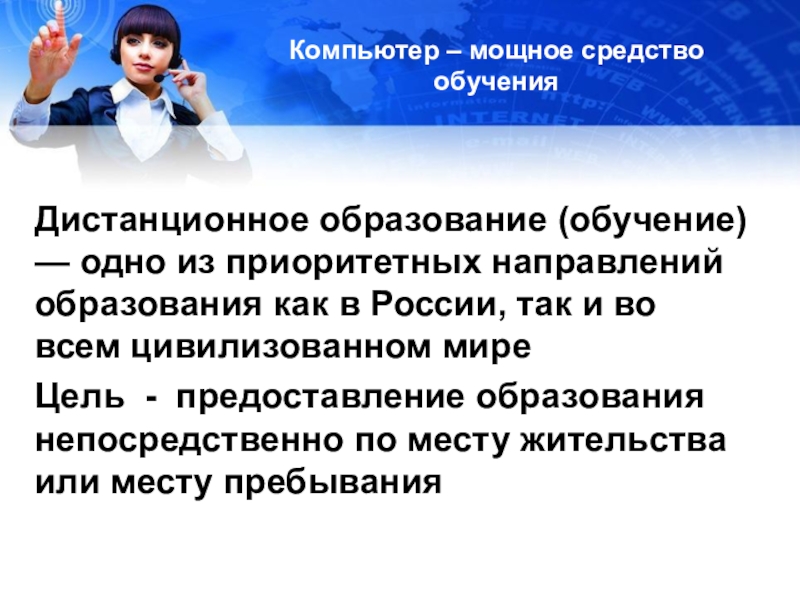 Компьютер – мощное средство обученияДистанционное образование (обучение) — одно из приоритетных направлений образования как в России, так и во всем цивилизованном мире Цель - предоставление образования непосредственно по месту жительства или месту пребывания