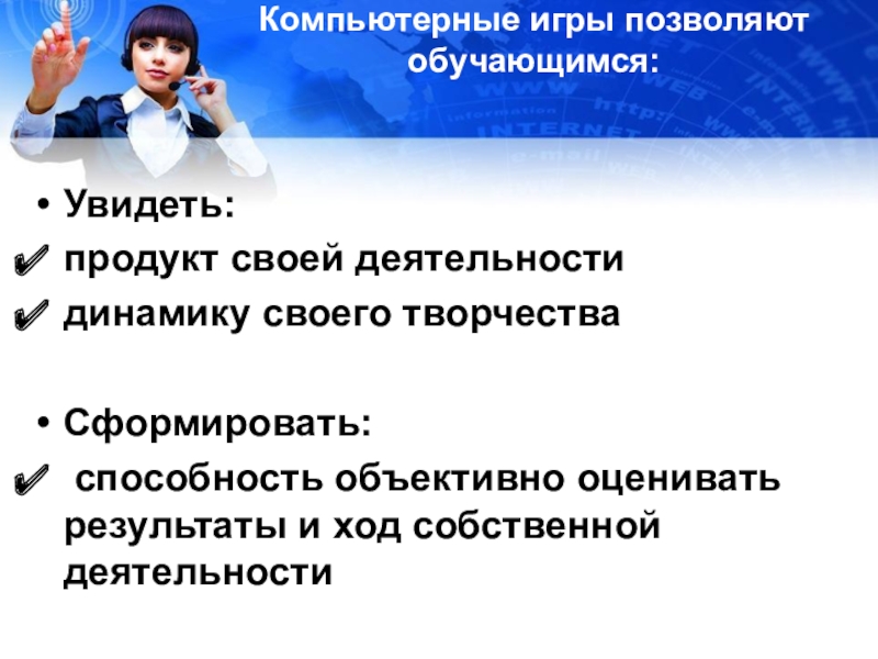 Компьютерные игры позволяют обучающимся: Увидеть:продукт своей деятельностидинамику своего творчества Сформировать: способность объективно оценивать результаты и ход собственной