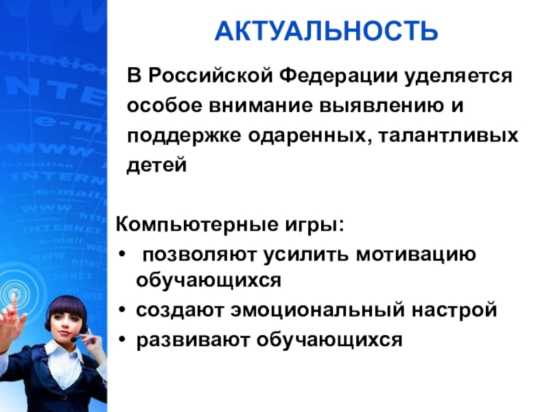 АКТУАЛЬНОСТЬ В Российской Федерации уделяется особое внимание выявлению и поддержке одаренных, талантливых детейКомпьютерные игры: позволяют усилить мотивацию