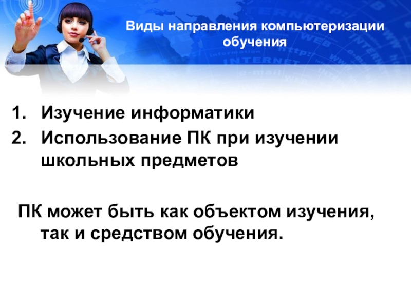 Виды направления компьютеризации обученияИзучение информатикиИспользование ПК при изучении школьных предметовПК может быть как объектом изучения, так и