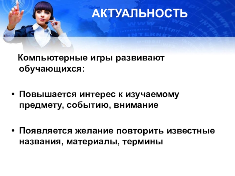 АКТУАЛЬНОСТЬ  Компьютерные игры развивают обучающихся:Повышается интерес к изучаемому предмету, событию, вниманиеПоявляется желание повторить известные названия, материалы,