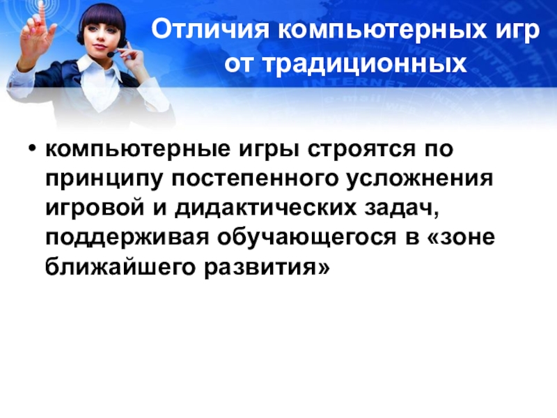 Отличия компьютерных игр  от традиционныхкомпьютерные игры строятся по принципу постепенного усложнения игровой и дидактических задач, поддерживая