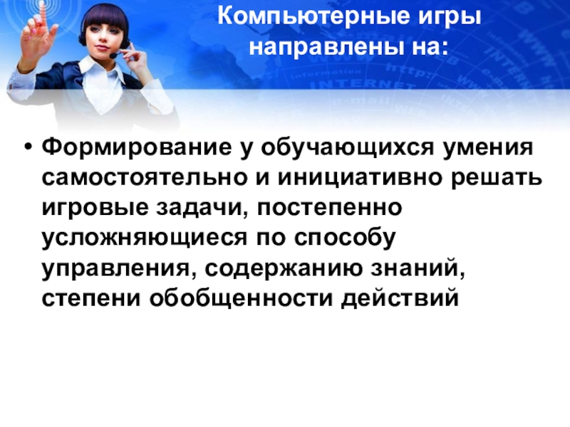 Компьютерные игры направлены на: Формирование у обучающихся умения самостоятельно и инициативно решать игровые задачи, постепенно усложняющиеся по