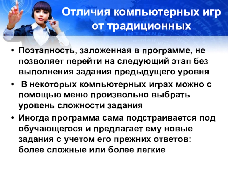 Отличия компьютерных игр  от традиционныхПоэтапность, заложенная в программе, не позволяет перейти на следующий этап без выполнения