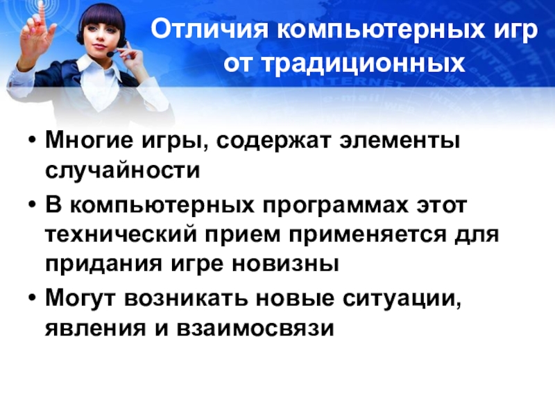 Отличия компьютерных игр  от традиционныхМногие игры, содержат элементы случайности В компьютерных программах этот технический прием применяется