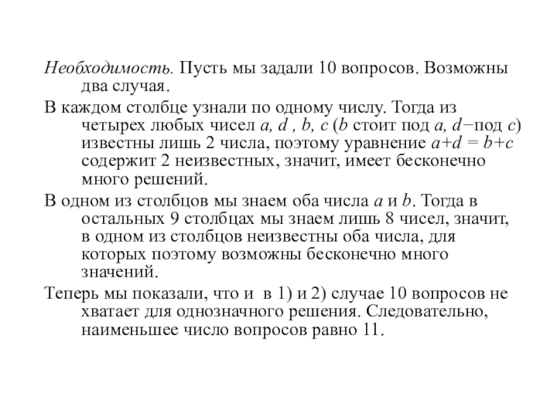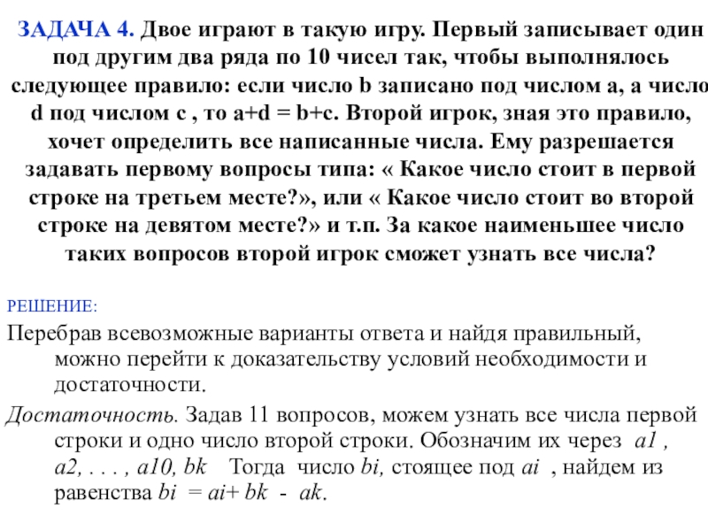 Перебрав всевозможные варианты ответа и найдя правильный, можно перейти к доказательству условий необходимости и достаточности.