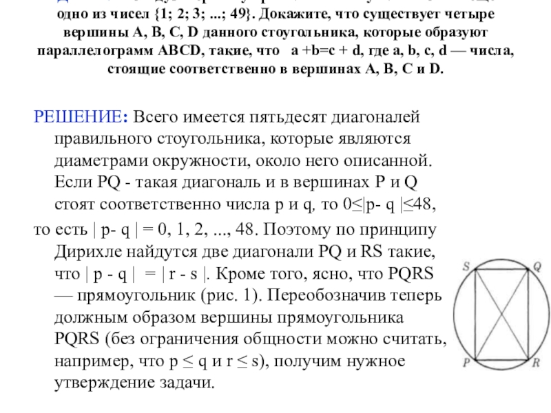 РЕШЕНИЕ: Всего имеется пятьдесят диагоналей правильного стоугольника, которые являются диаметрами окружности, около него описанной. Если PQ - такая диагональ и в вершинах Р и Q стоят соответственно числа р и q, то 0≤|р- q |≤48,