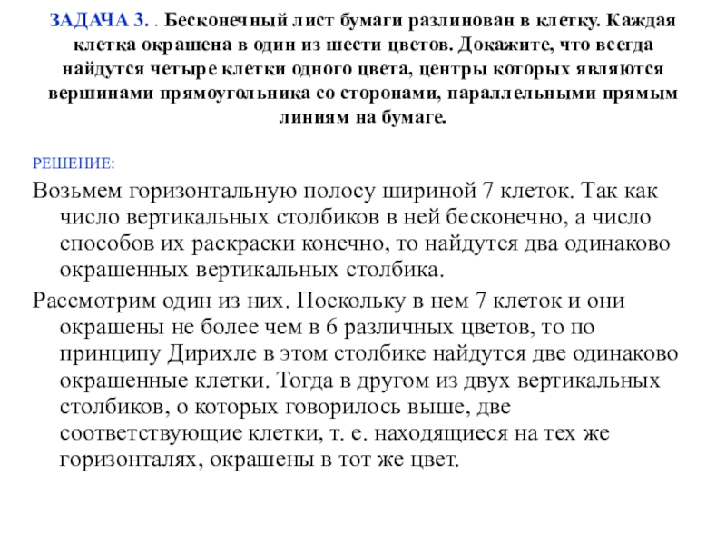 Рассмотрим один из них. Поскольку в нем 7 клеток и они окрашены не более чем в 6 различных цветов, то по принципу Дирихле в этом столбике найдутся две одинаково окрашенные клетки. Тогда в другом из двух вертикальных столбиков, о которых говорилось выше, две соответствующие клетки, т. е. находящиеся на тех же горизонталях, окрашены в тот же цвет.