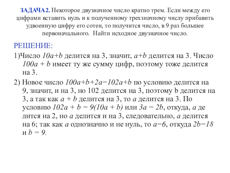 2) Новое число 100а+b+2а=102а+b по условию делится на 9, значит, и на 3, но 102 делится на 3, поэтому b делится на 3, а так как а + b делится на 3, то а делится на 3. По условию 102а + b = 9(10а + b) или 3а = 2b, откуда, а делится на 2, но а делится и на 3, следовательно, а делится на 6; так как а однозначно и не нуль, то а=6, откуда 2b=18 и b = 9.