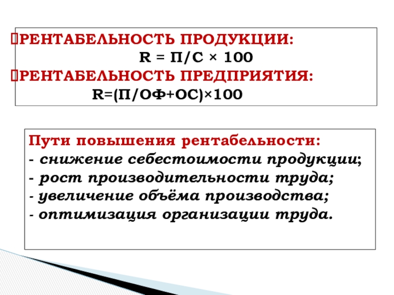 РЕНТАБЕЛЬНОСТЬ – относительный показатель эффективности производства, характеризующий уровень отдачи затрат и степень использования ресурсов