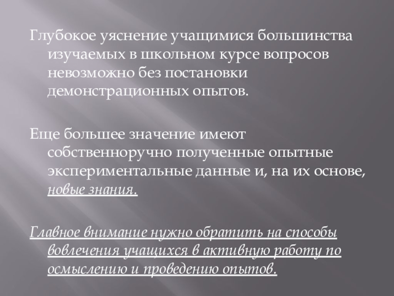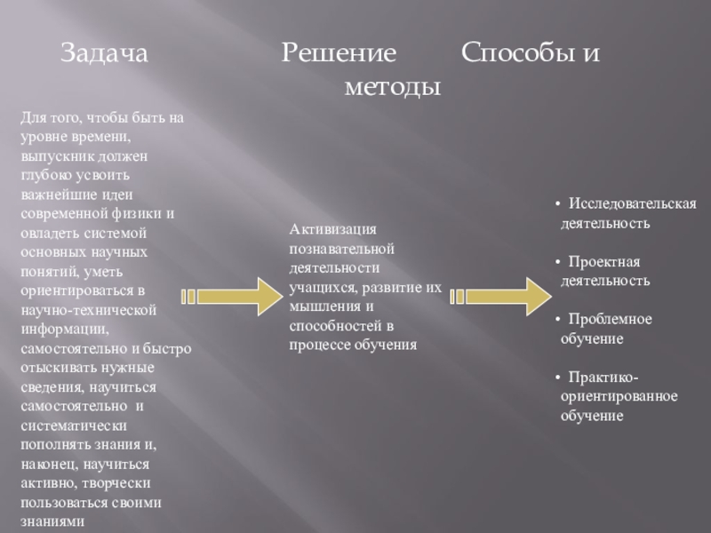 Для того, чтобы быть на уровне времени, выпускник должен глубоко усвоить важнейшие идеи современной физики и овладеть системой основных научных понятий, уметь ориентироваться в научно-технической информации, самостоятельно и быстро отыскивать нужные сведения, научиться самостоятельно и систематически пополнять знания и, наконец, научиться активно, творчески пользоваться своими знаниями