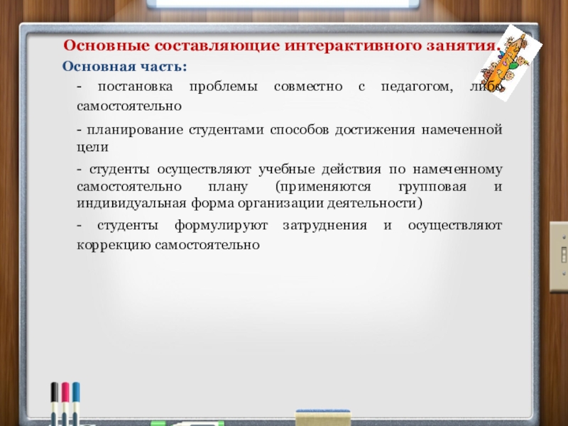 Основные составляющие интерактивного занятия.Основная часть:- постановка проблемы совместно с педагогом, либо самостоятельно- планирование студентами способов достижения намеченной