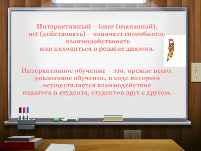 Интерактивный – inter (взаимный), act (действовать) – означает способность взаимодействовать или находиться в режиме диалога.Интерактивное обучение –