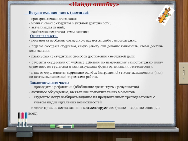 «Найди ошибку»  Вступительная часть (вводная):- проверка домашнего задания; - мотивирование студентов к учебной деятельности; - актуализация