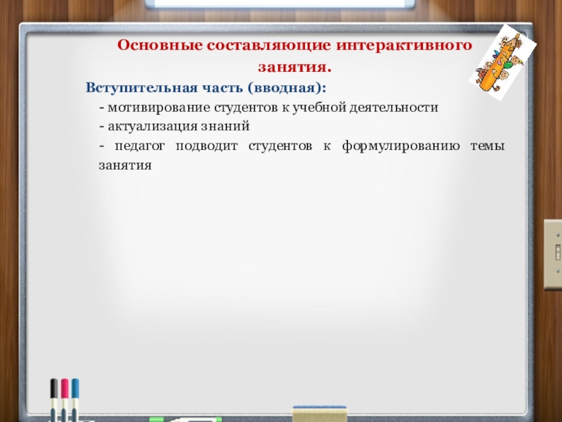 Основные составляющие интерактивного занятия.Вступительная часть (вводная):- мотивирование студентов к учебной деятельности - актуализация знаний - педагог подводит
