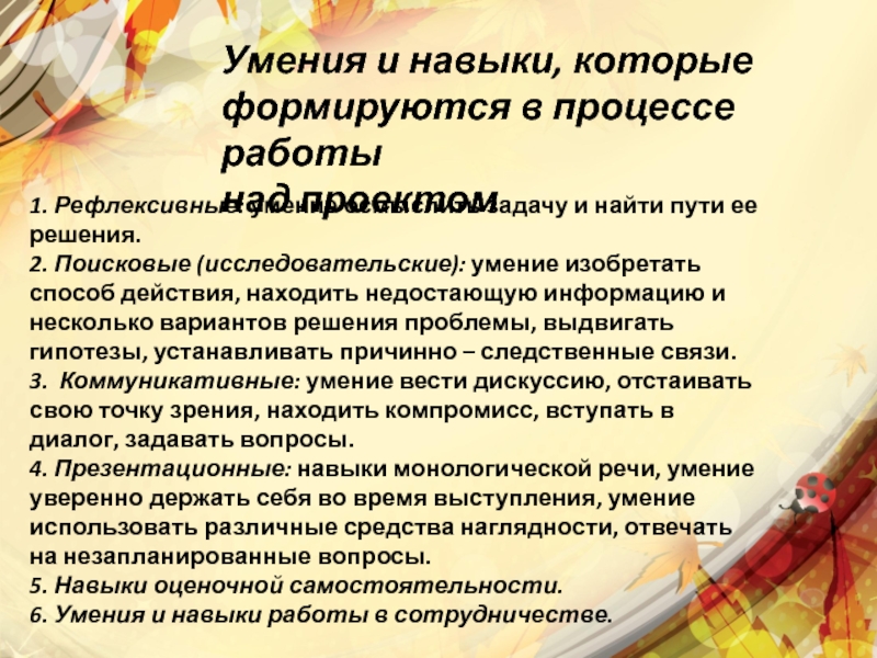 4. Презентационные: навыки монологической речи, умение уверенно держать себя во время выступления, умение использовать различные средства наглядности, отвечать на незапланированные вопросы.