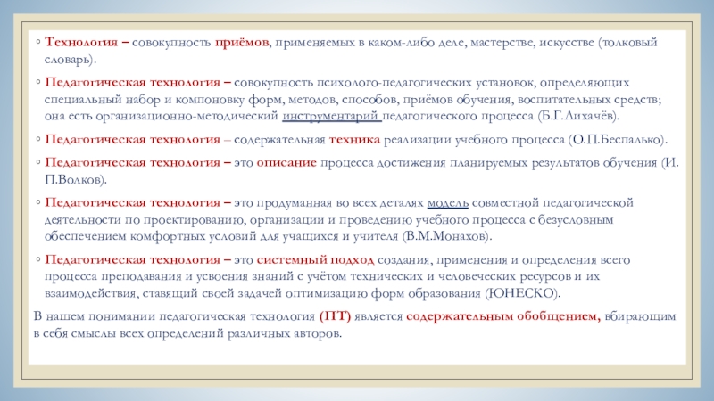В нашем понимании педагогическая технология (ПТ) является содержательным обобщением, вбирающим в себя смыслы всех определений различных авторов.