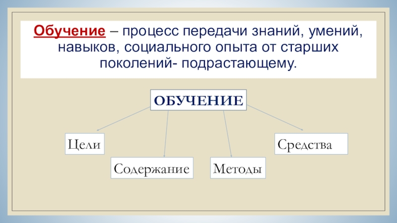 Слайд 2Обучение – процесс передачи знаний, умений, навыков, социального опыта от старших