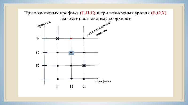 Слайд 10Три возможных профиля (Г,П,С) и три возможных уровня (Б,О,У) выводят нас