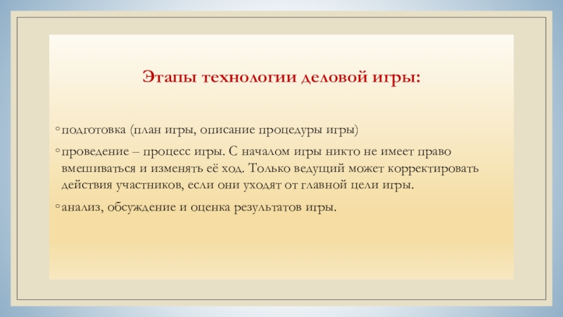игры. С началом игры никто не имеет право вмешиваться и изменять её ход. Только ведущий может корректировать действия участников, если они уходят от главной цели игры.