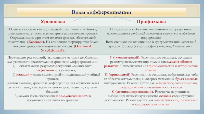 Дифференциация – такая система обучения, при которой каждый ученик, овладевая некоторым минимумом общеобразовательной подготовки, получает право и гарантированную возможность уделять преимущественное внимание тем направлениям, которые в наибольшей степени отвечают его склонностям.
