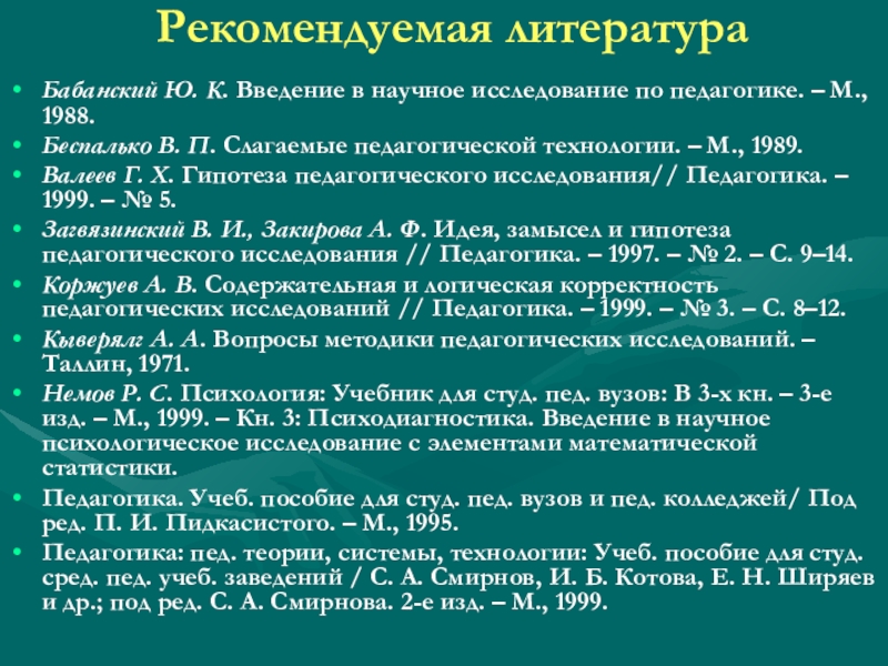 Бабанский Ю. К. Введение в научное исследование по педагогике. – М.,