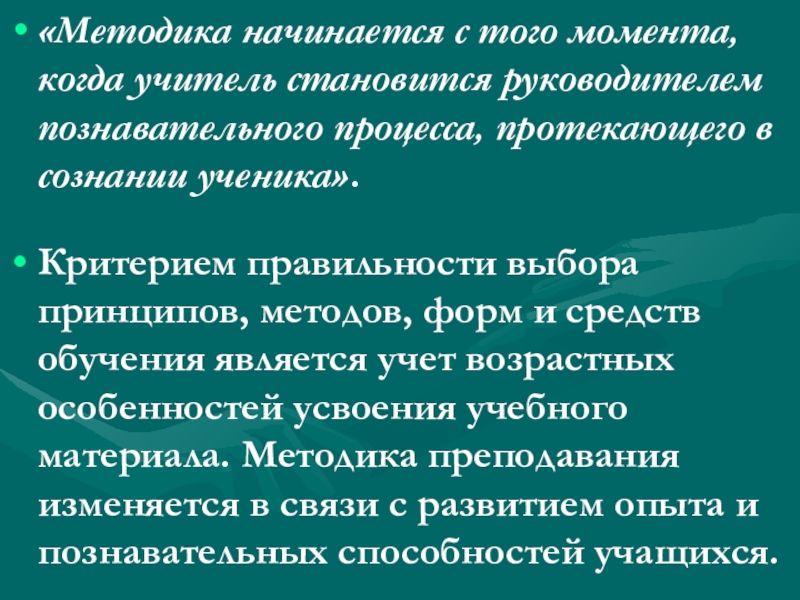 Критерием правильности выбора принципов, методов, форм и средств обучения является учет возрастных особенностей усвоения учебного материала. Методика преподавания изменяется в связи с развитием опыта и познавательных способностей учащихся.