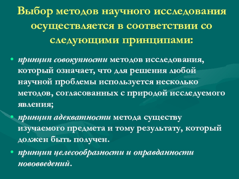 Слайд 20Выбор методов научного исследования осуществляется в соответствии со следующими принципами: