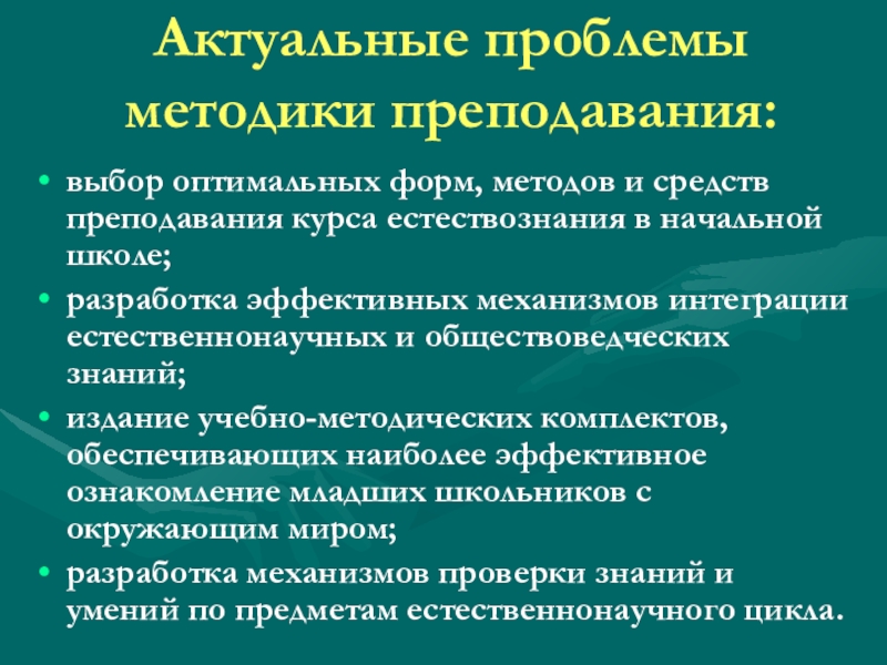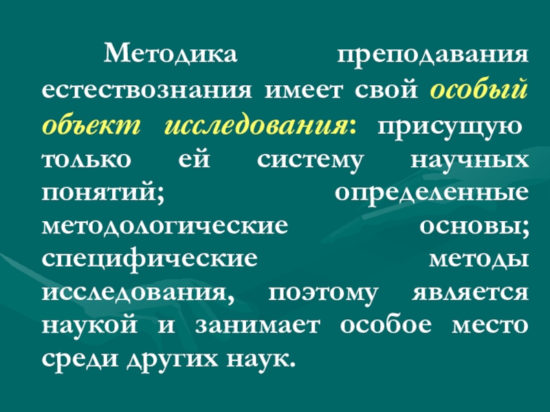 Слайд 6 Методика преподавания естествознания имеет свой особый объект исследования: присущую только ей