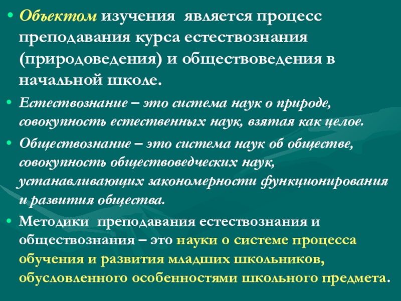 Слайд 7Объектом изучения является процесс преподавания курса естествознания (природоведения) и обществоведения в
