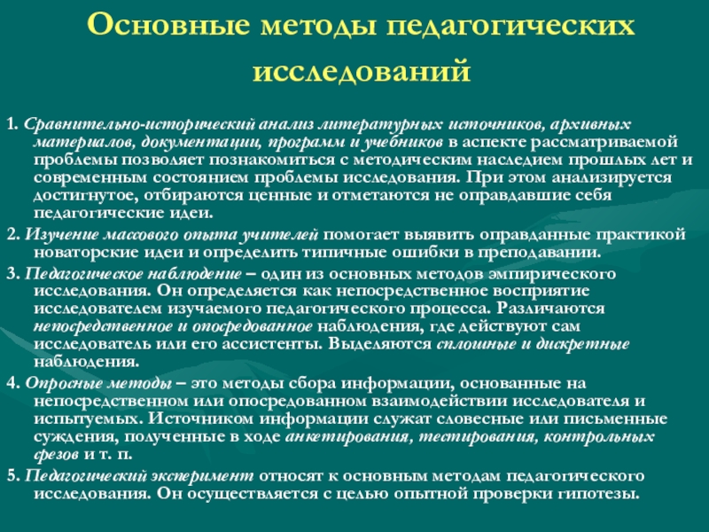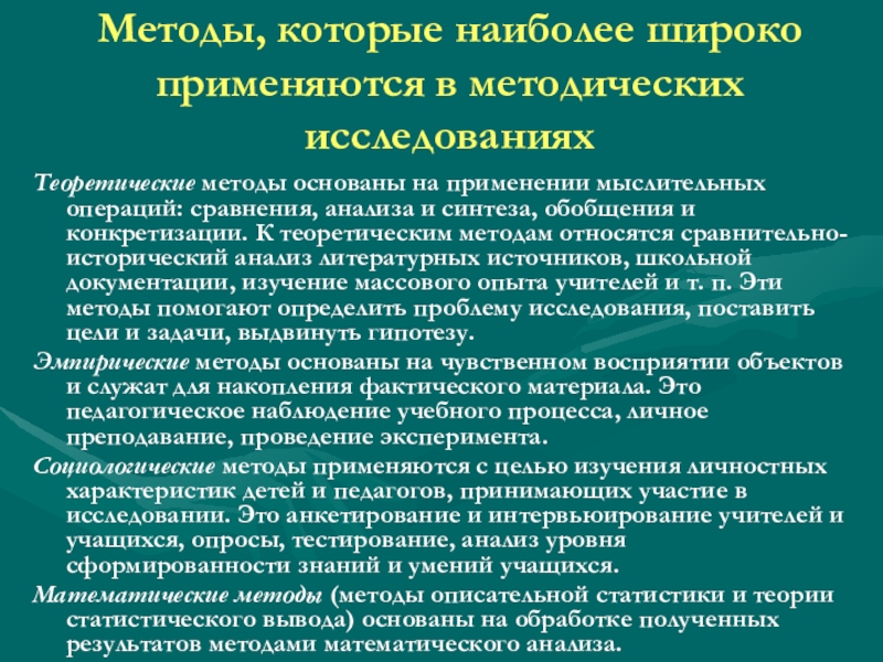 применении мыслительных операций: сравнения, анализа и синтеза, обобщения и конкретизации. К теоретическим методам относятся сравнительно-исторический анализ литературных источников, школьной документации, изучение массового опыта учителей и т. п. Эти методы помогают определить проблему исследования, поставить цели и задачи, выдвинуть гипотезу.