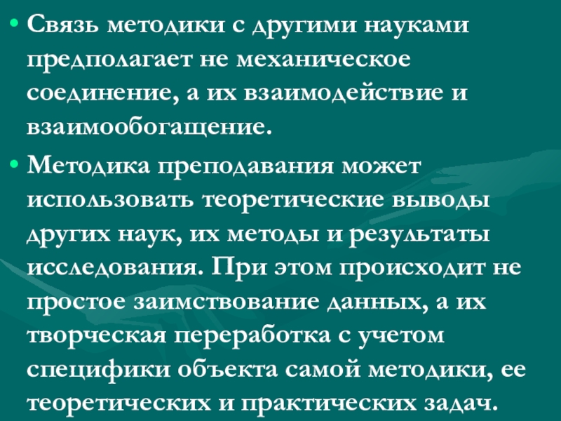 Методика преподавания может использовать теоретические выводы других наук, их методы и результаты исследования. При этом происходит не простое заимствование данных, а их творческая переработка с учетом специфики объекта самой методики, ее теоретических и практических задач.