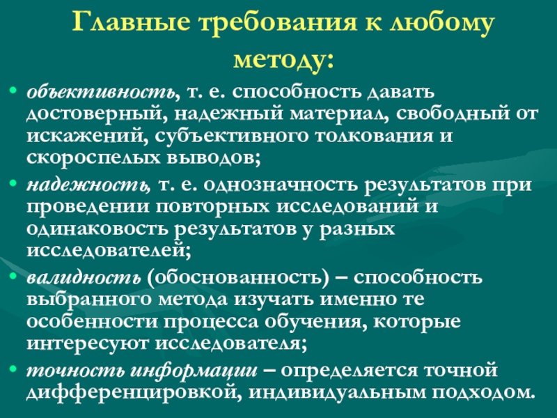 валидность (обоснованность) – способность выбранного метода изучать именно те особенности процесса обучения, которые интересуют исследователя;