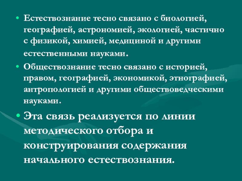 Эта связь реализуется по линии методического отбора и конструирования содержания начального естествознания.