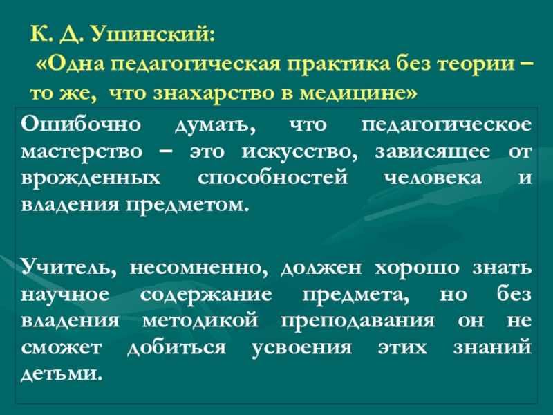 Учитель, несомненно, должен хорошо знать научное содержание предмета, но без владения методикой преподавания он не сможет добиться усвоения этих знаний детьми.