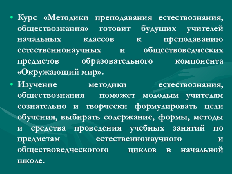 Слайд 5Курс «Методики преподавания естествознания, обществознания» готовит будущих учителей начальных классов к