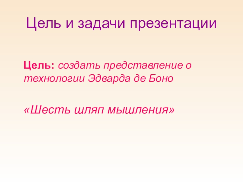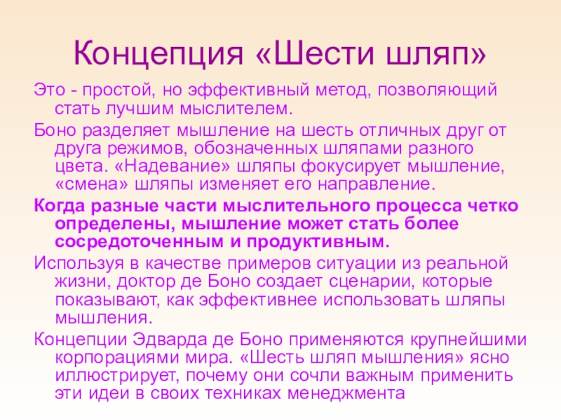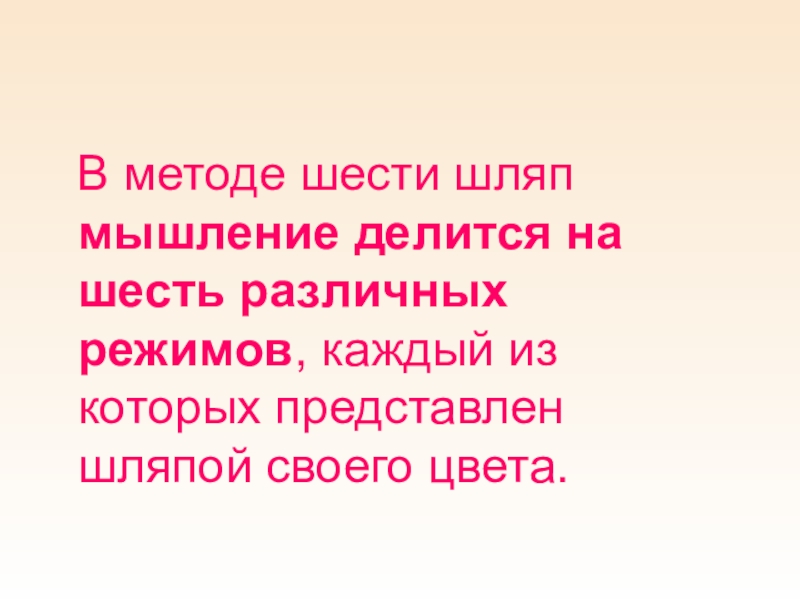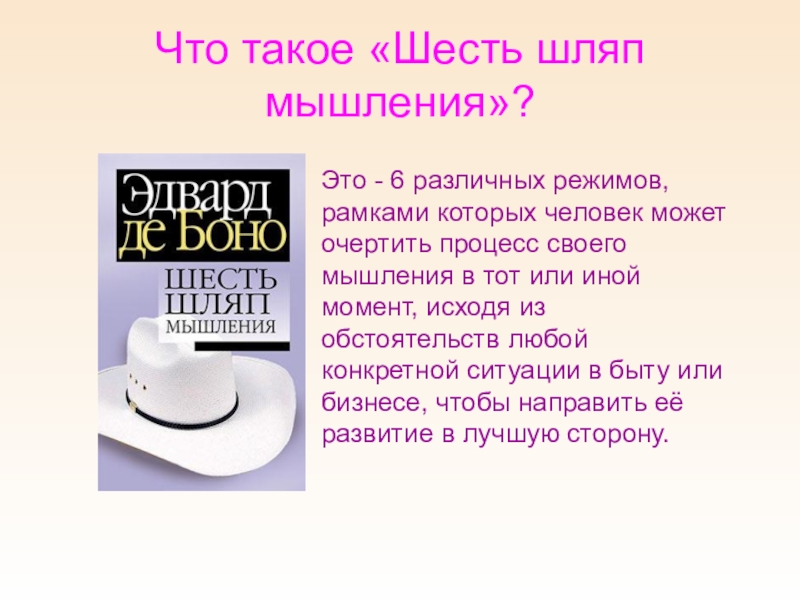 Боно разделяет мышление на шесть отличных друг от друга режимов, обозначенных шляпами разного цвета. «Надевание» шляпы фокусирует мышление, «смена» шляпы изменяет его направление.
