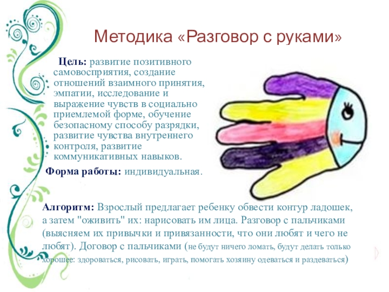 Алгоритм: Взрослый предлагает ребенку обвести контур ладошек, а затем "оживить" их: нарисовать им лица. Разговор с пальчиками (выясняем их привычки и привязанности, что они любят и чего не любят). Договор с пальчиками (не будут ничего ломать, будут делать только хорошее: здороваться, рисовать, играть, помогать хозяину одеваться и раздеваться)